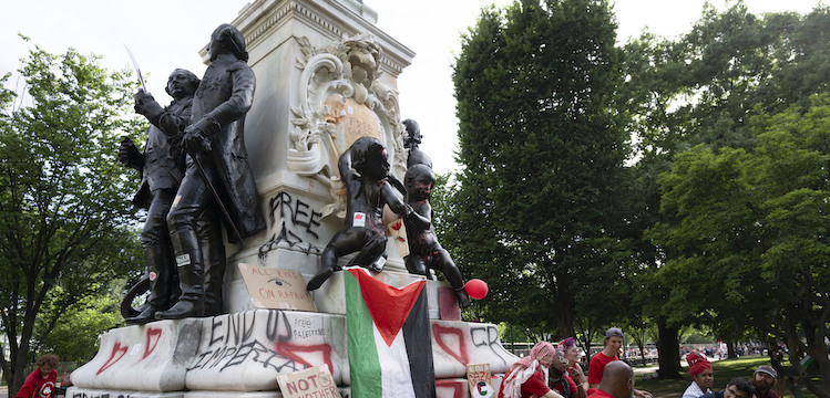 And finally, Clarifying Moment #4, here at home. What happened in Washington on Saturday as Biden tried to recover from the chair incident was a full-blown demonstration across the street from the White House that can only be described as a Hamas rally—complete with the desecrations of American statuary. The footage from this nauseating event, including Park Police standing mute and ineffective as spray cans mottled the statue of the Marquis de Lafayette—who is no longer an obscure figure from the past but is now known to all Americans under the age of 25 as America’s best friend from the 18th century due to Hamilton—is a gift that will keep giving to Republicans and Trump as they head to the November elections.